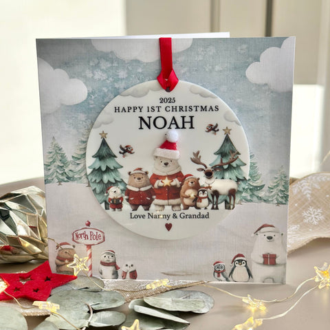 Featuring a personalised detachable hanging decoration with a Santa design printed directly onto a white acrylic heart shape and finished off with a satin ribbon. It measures 10cm and 4mm thick and is mounted on a 15cm square card, comes with a self seal white envelope.